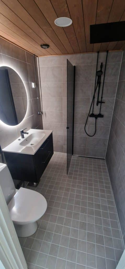 Kylpyhuoneisiin, WC-tiloihin ja huoneistosaunoihin asennettiin maalämpöön liitetyt, vesikiertoiset lattialämmitykset.