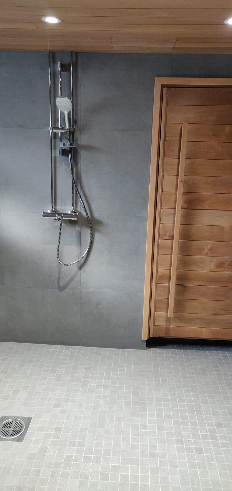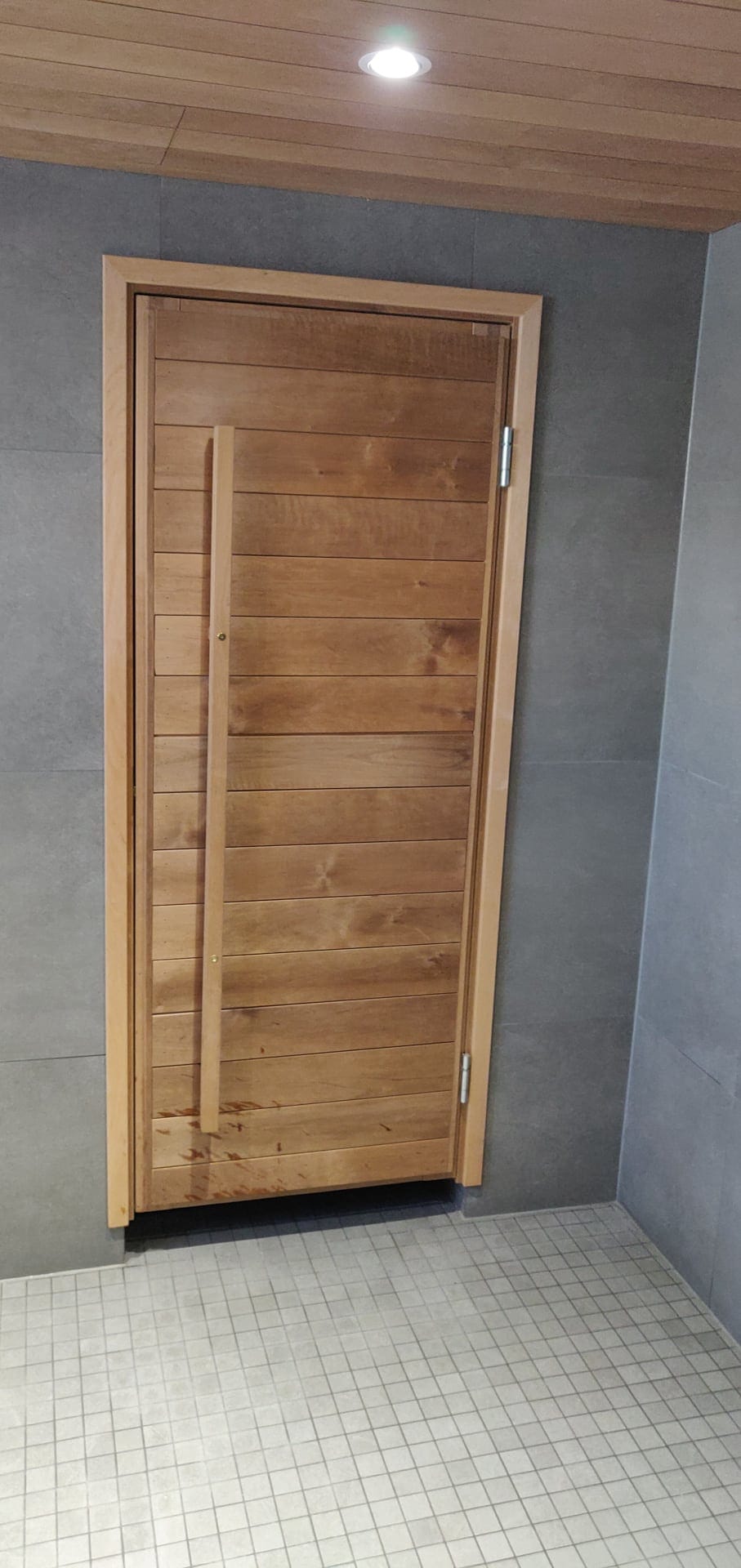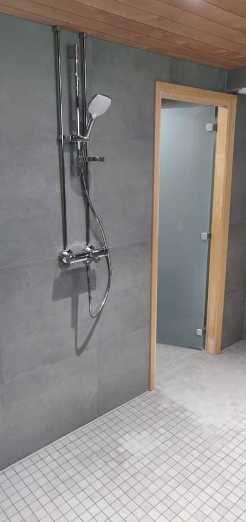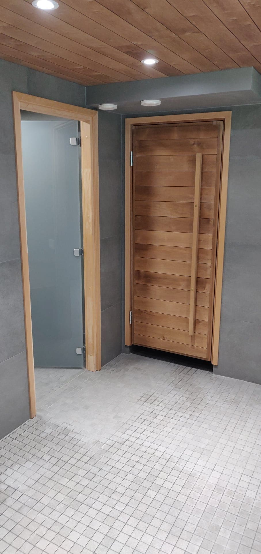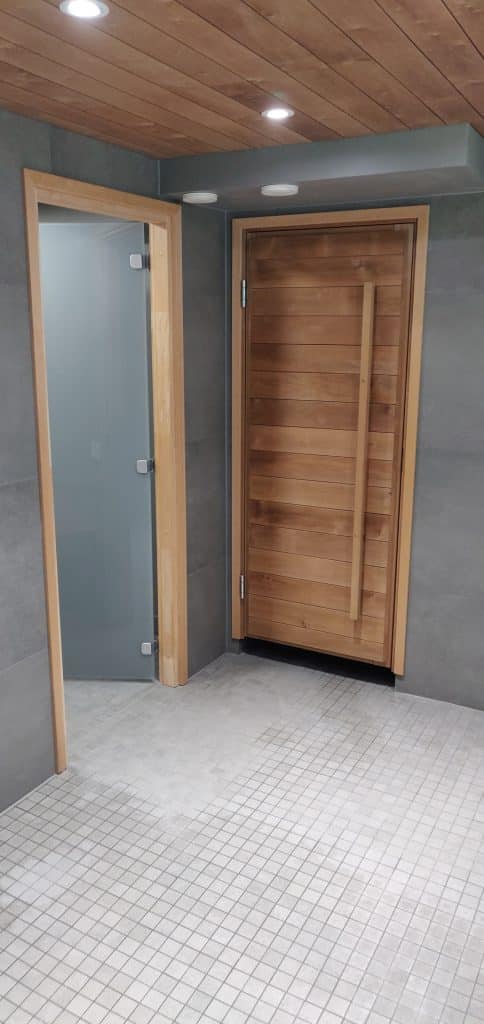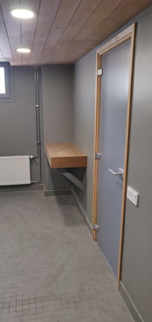 Saunaosastolla käytettiin rektifioitua Pro Stone 60×60 Dark Grey -seinälaattaa, yhdistettynä saman laatan 5×5 mosaiikkiin lattiassa. Maalipintaisia tekniikkakotelointeja varten sävytettiin Tikkurilan Luja 20 sävyyn M497 Tuhka. Tilojen tunnelman viimeistelee katoissa, saunassa ja ovissa käytetty STS-profiilin 15×120 tervaleppäpaneeli ja tervaleppälaudelauta.