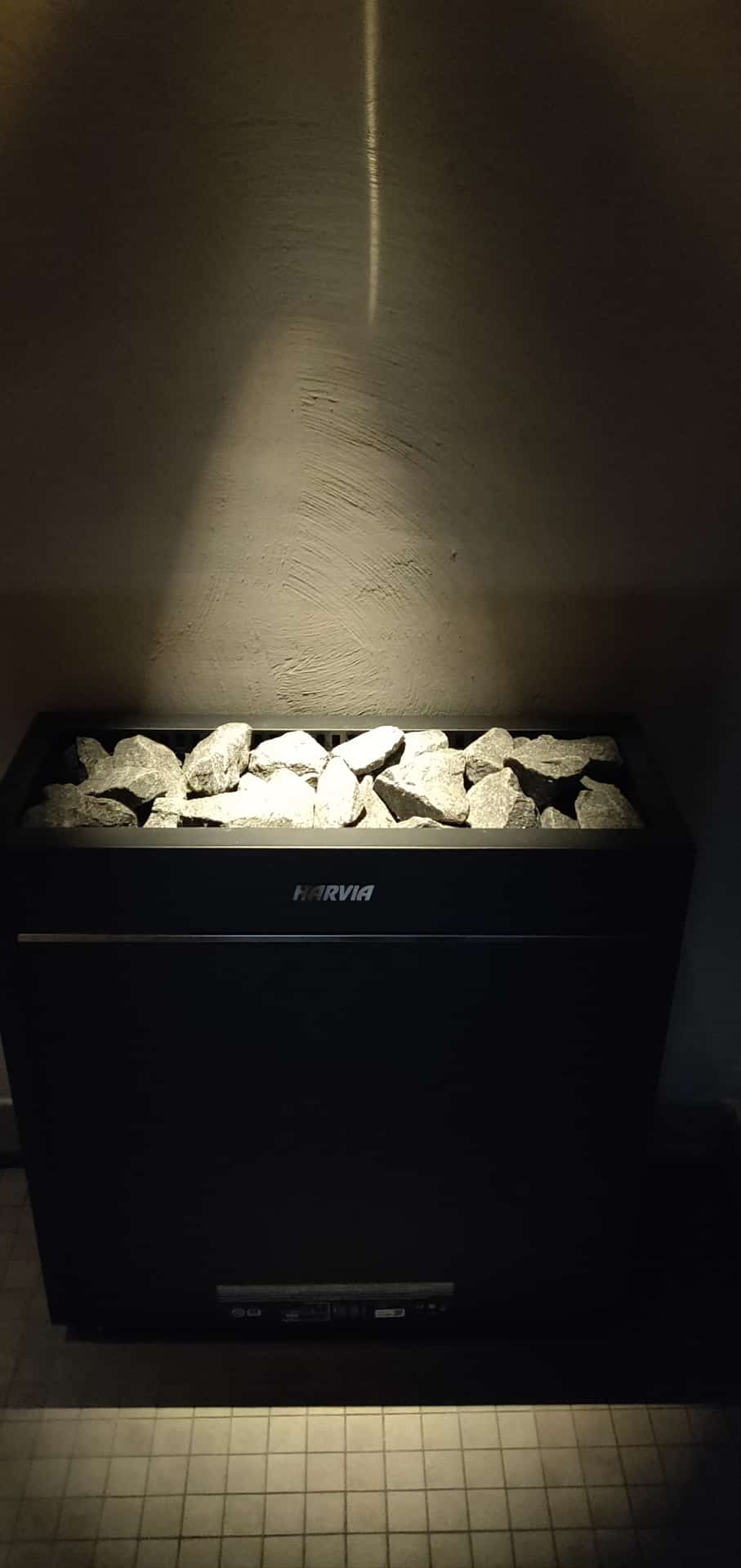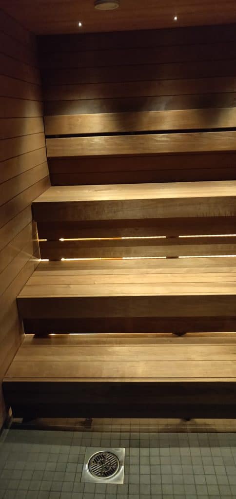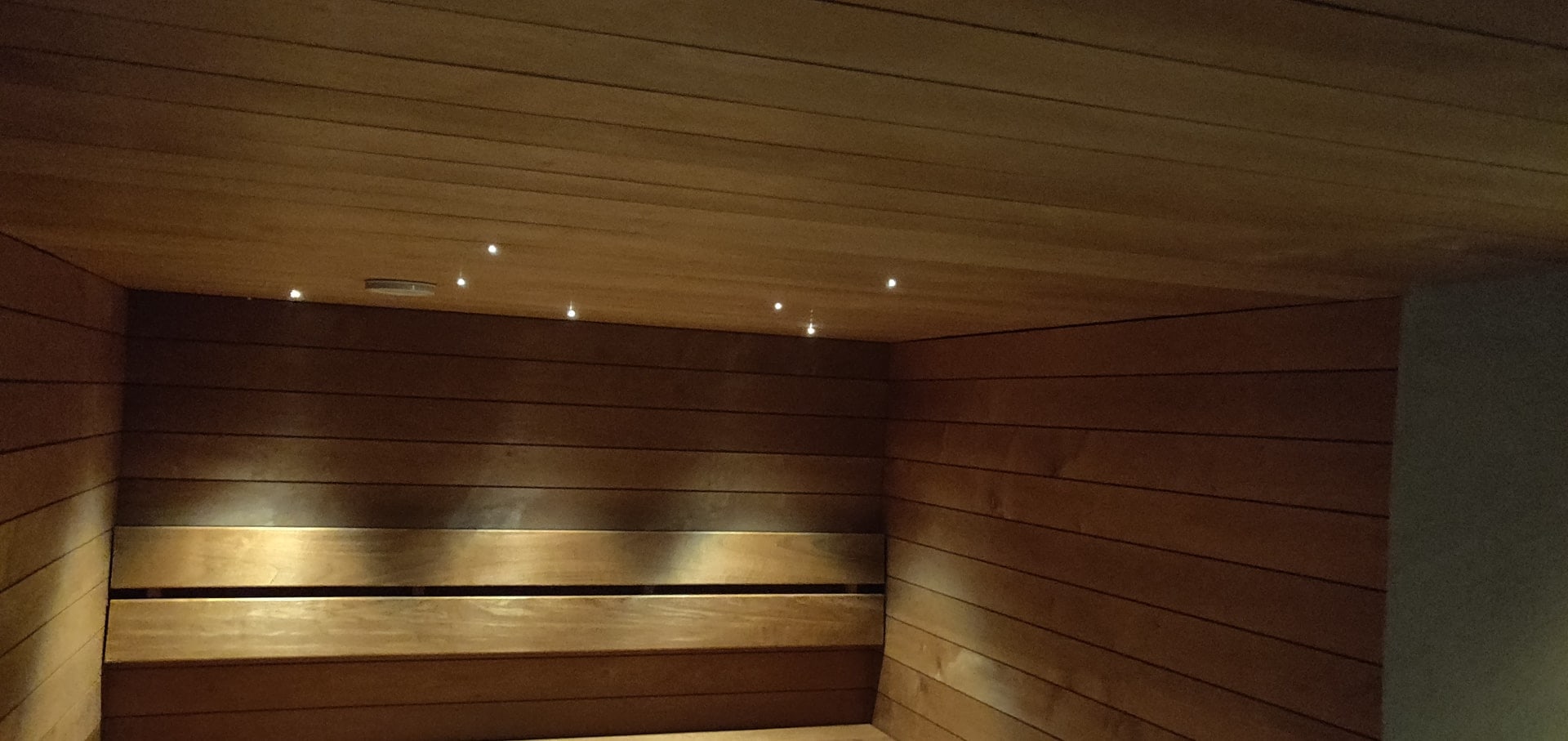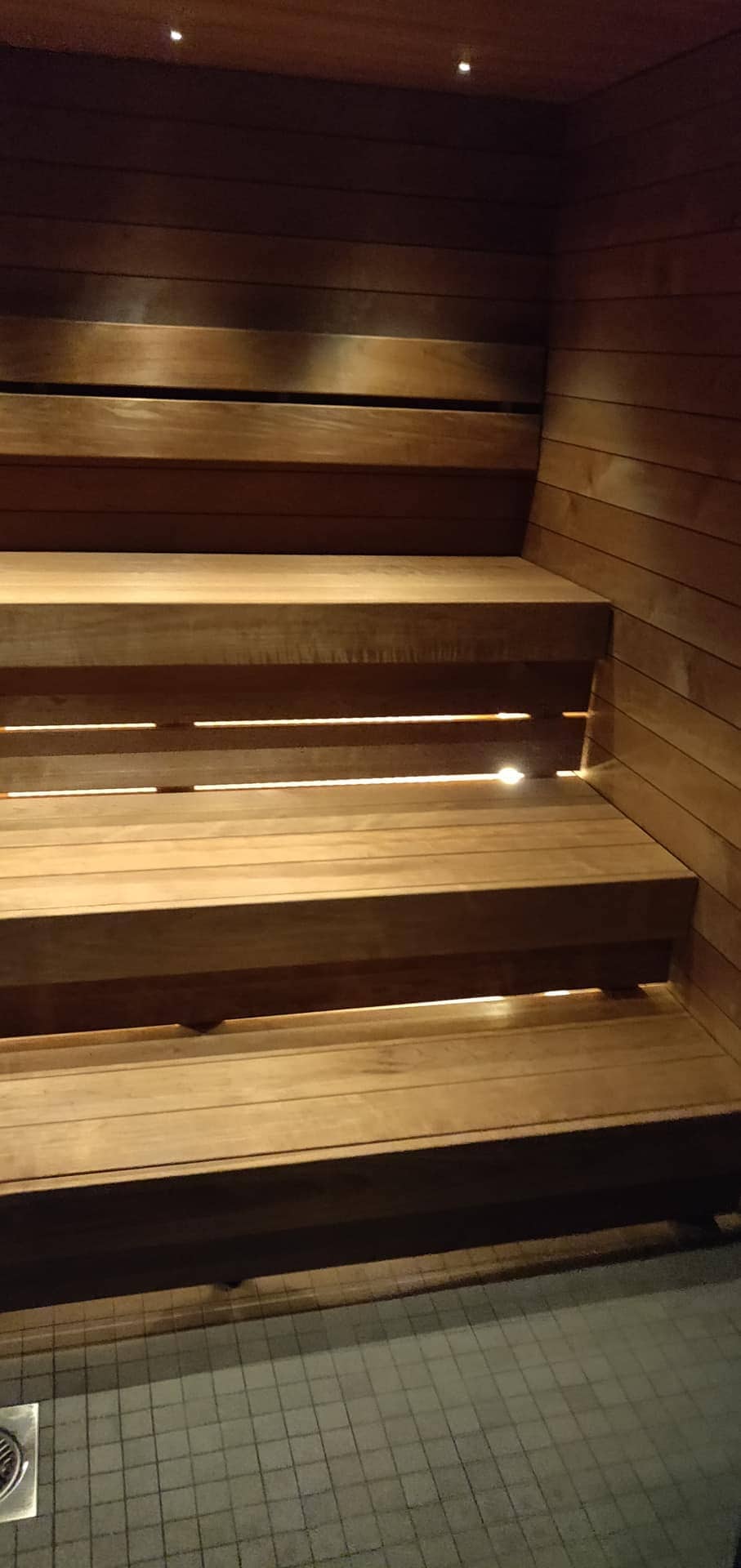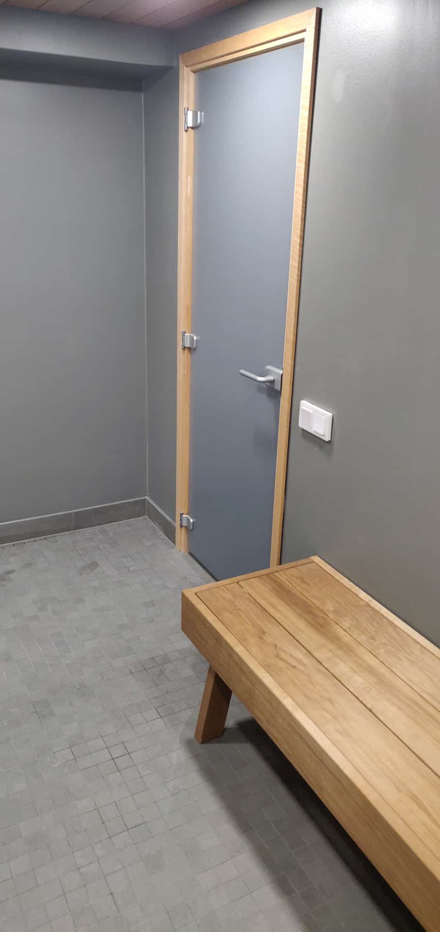 Saunaosastolla käytettiin rektifioitua Pro Stone 60×60 Dark Grey -seinälaattaa, yhdistettynä saman laatan 5×5 mosaiikkiin lattiassa. Maalipintaisia tekniikkakotelointeja varten sävytettiin Tikkurilan Luja 20 sävyyn M497 Tuhka. Tilojen tunnelman viimeistelee katoissa, saunassa ja ovissa käytetty STS-profiilin 15×120 tervaleppäpaneeli ja tervaleppälaudelauta.