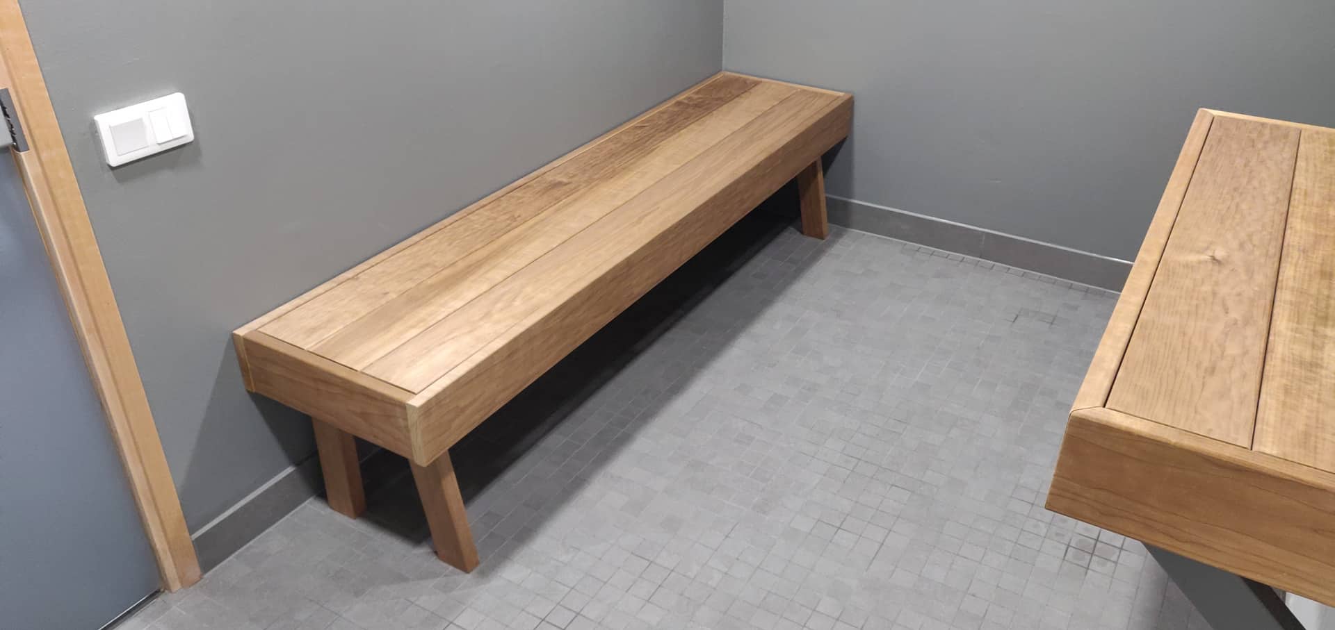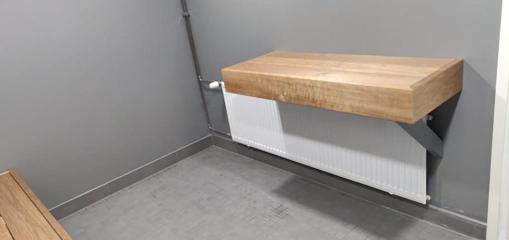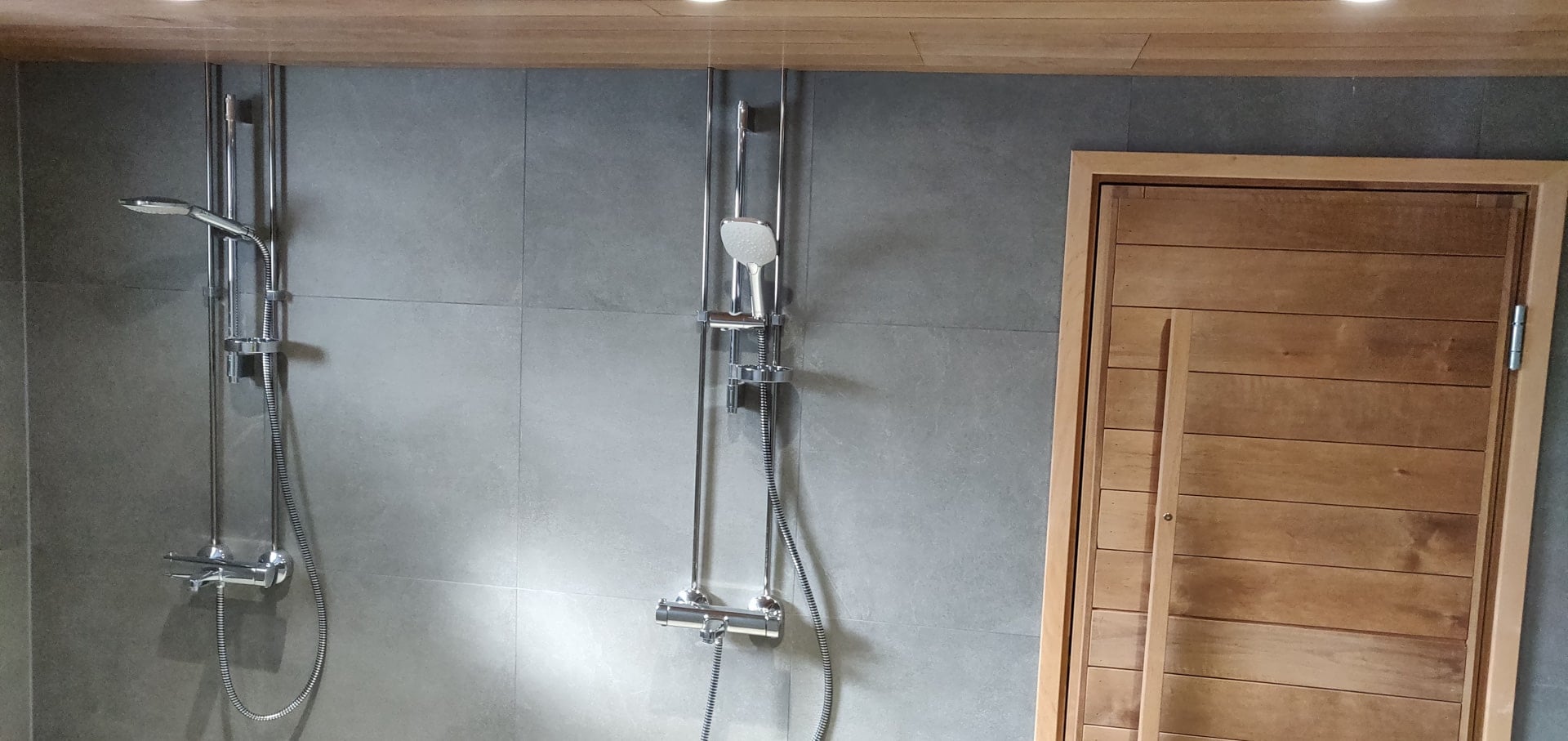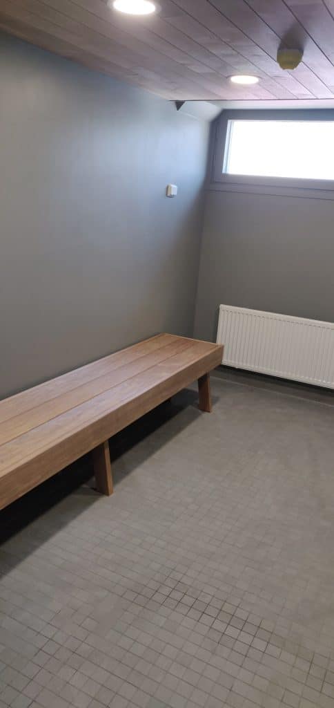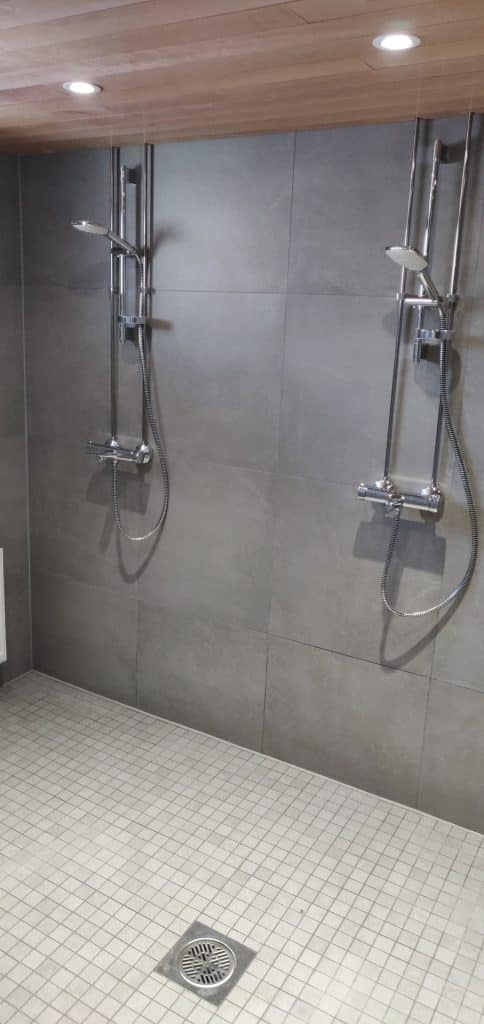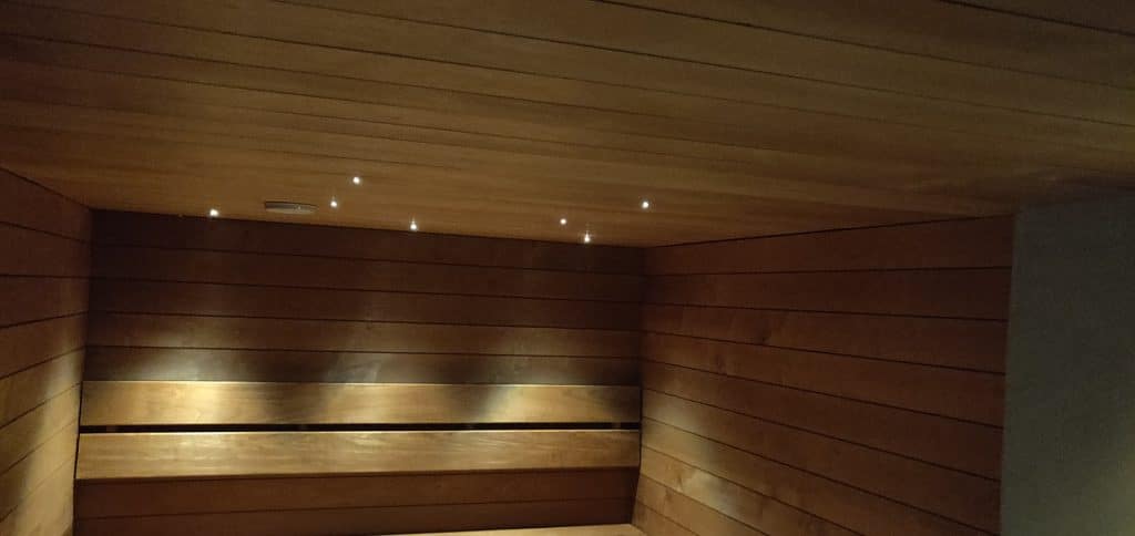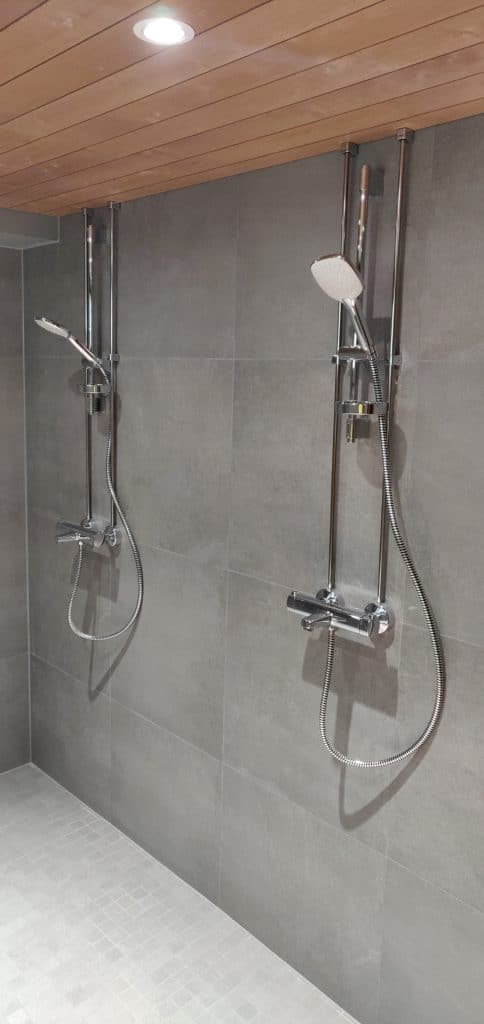 Saunaosastolla käytettiin rektifioitua Pro Stone 60×60 Dark Grey -seinälaattaa, yhdistettynä saman laatan 5×5 mosaiikkiin lattiassa. Maalipintaisia tekniikkakotelointeja varten sävytettiin Tikkurilan Luja 20 sävyyn M497 Tuhka. Tilojen tunnelman viimeistelee katoissa, saunassa ja ovissa käytetty STS-profiilin 15×120 tervaleppäpaneeli ja tervaleppälaudelauta.