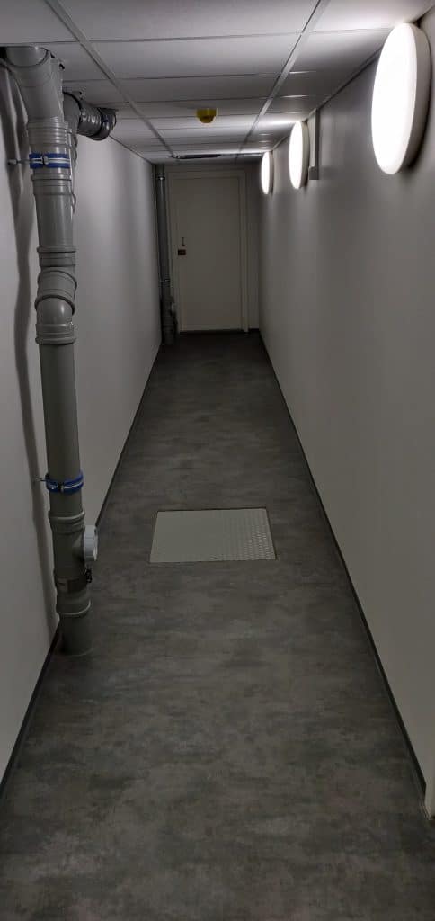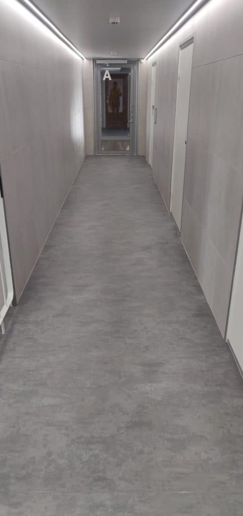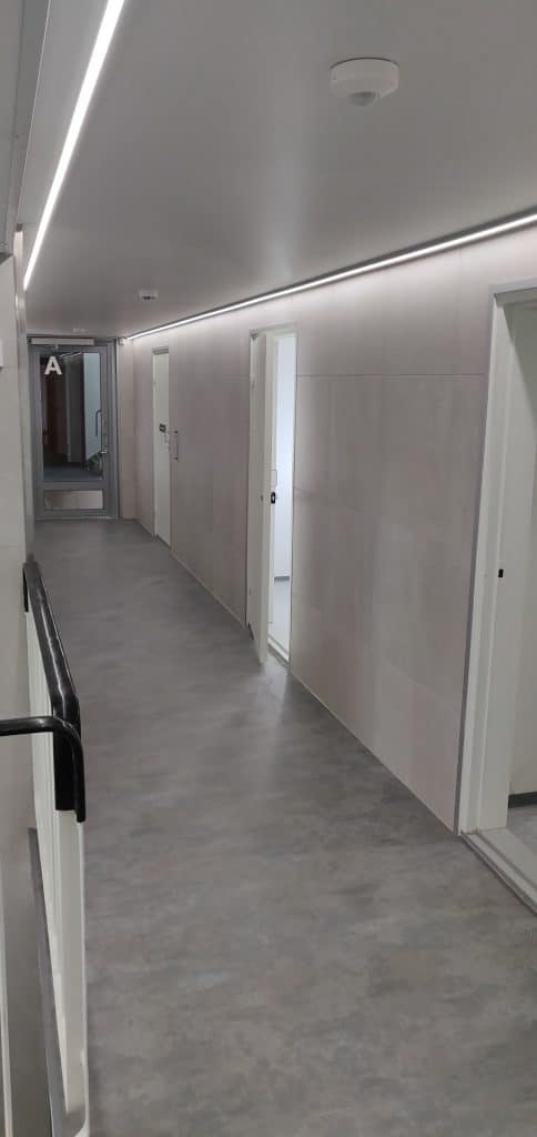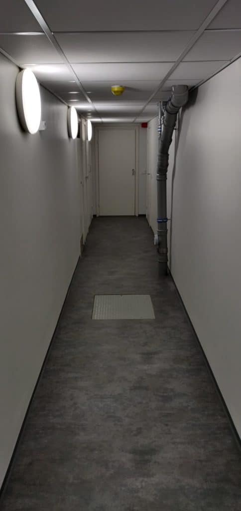 Porrashuoneen ovet ovat varustettu automaattisella avauksella. Välikäytävän palo-osastoivan alakaton pintaan on asennettu epäsuora valaistus. Lisäksi yleisten tilojen paljon käytetyt ovet on listoitettu metallilistoilla paremman kestävyyden ja matalamman listaprofiilin aikaansaamiseksi. Kohteen lattioina on käytetty akustista ja kulutusta kestävää Silentflor PUR 6699 Cool Concrete –mattoa.