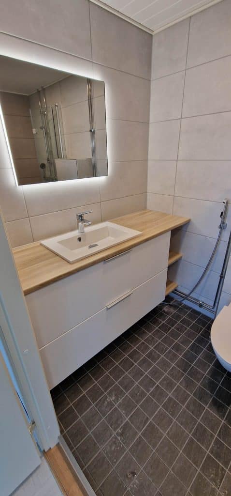 Kohteessa panostettiin kauttaaltaan materiaaleissa laatuun ja tyyliin. Porrashuoneiden auloissa käytettiin 60×60 Pro Matrix -laattaa epoksisaumauksin. Asuntoissa asennettiin kylpyhuoneisiin ja vessoihin seinä-WC:t ja Unidrain-linjalattiakaivot, sekä suurempia 30×60 cm rektifioituja seinälaattoja.